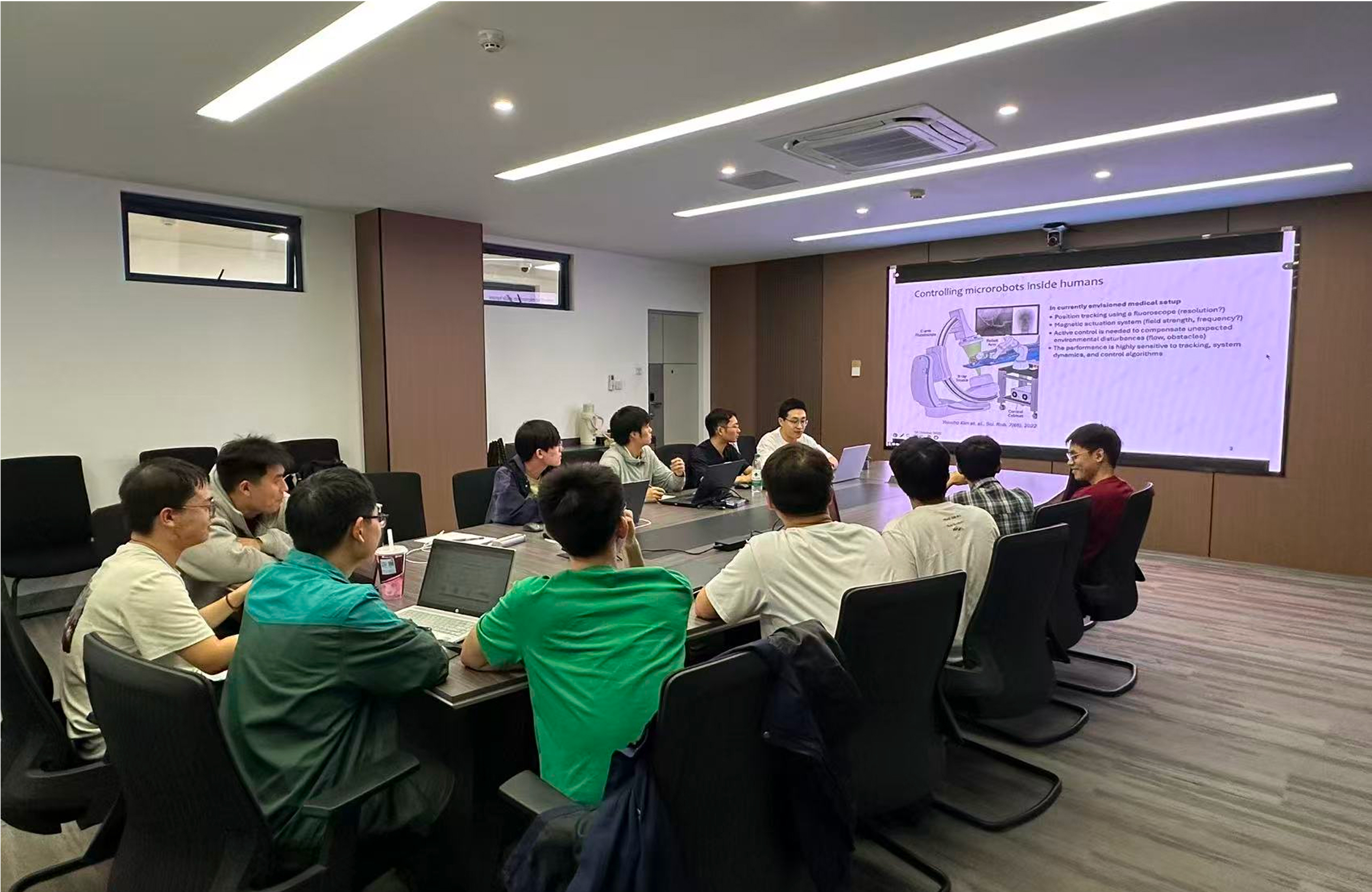 The team members swarm in discussing the microrobotic control logic (November, 2024).